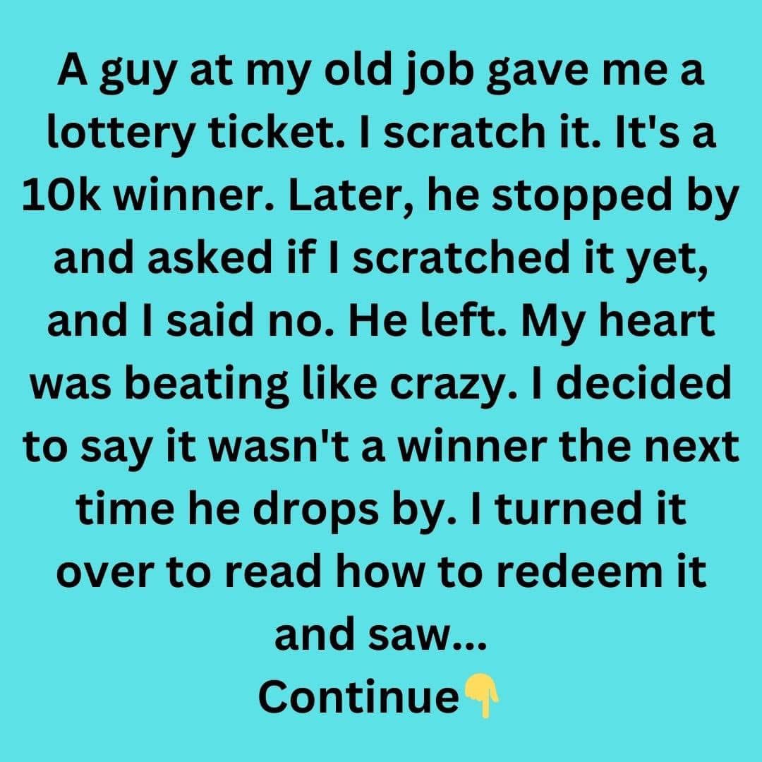 A guy at my old job gave me a lottery ticket. I scratch it. It’s a 10k winner. Later, he stopped by and asked if I scratched…