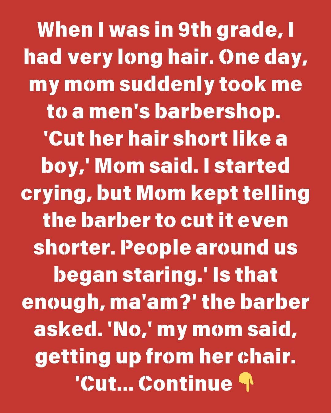 When I was in ninth school, I had quite long hair. One day, my mother unexpectedly took me to the barbershop. ‘Cut her hair short like a…