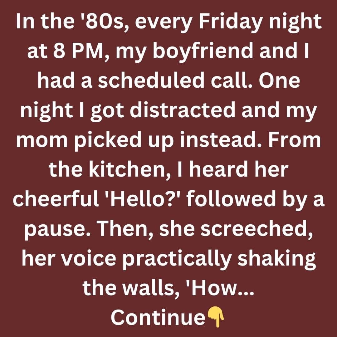 In the ’80s, my boyfriend and I had a weekly 8 PM call, until one night I missed it. My mom, closest to the phone, answered instead….