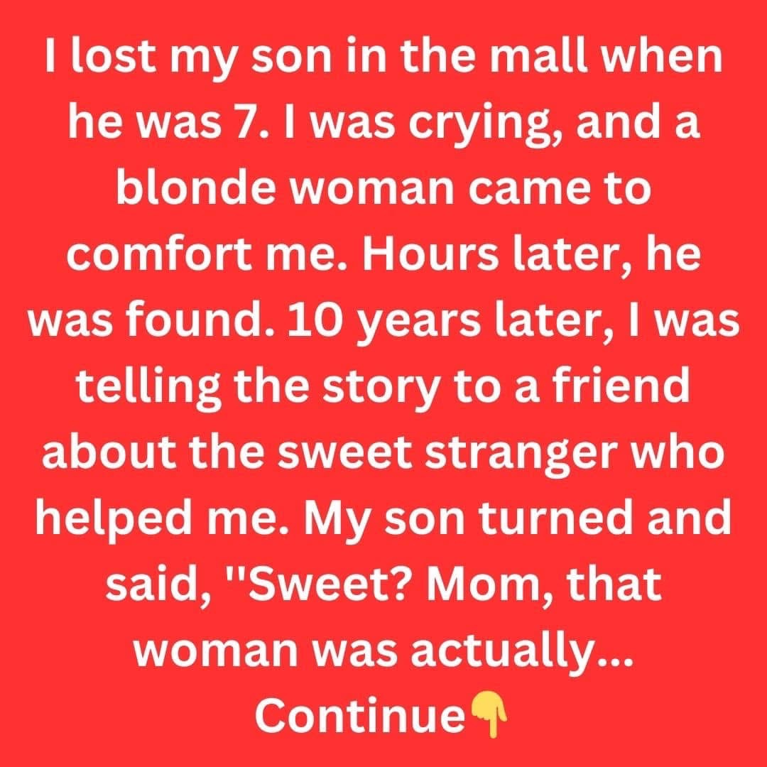 I lost my son in the mall when he was 7. I was crying, and a blonde woman came to comfort me. Hours later, he was found.10…