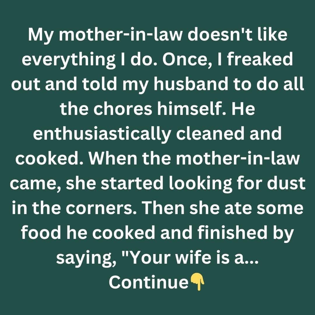 I have a classic mother-in-law: she doesn’t like everything I do. Once, I freaked out and told my husband to do all the chores himself. He enthusiastically…