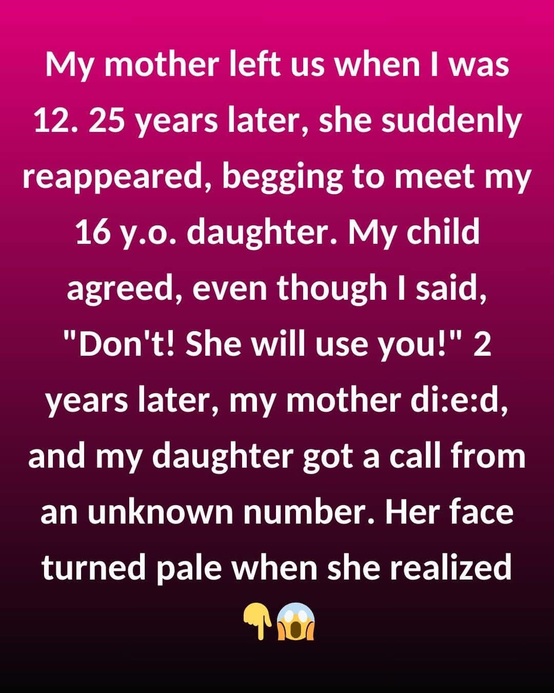 My mother left us when I was 12. 25 years later, she suddenly reappeared, begging to meet my 16 y.o. daughter. My child agreed, even though I…