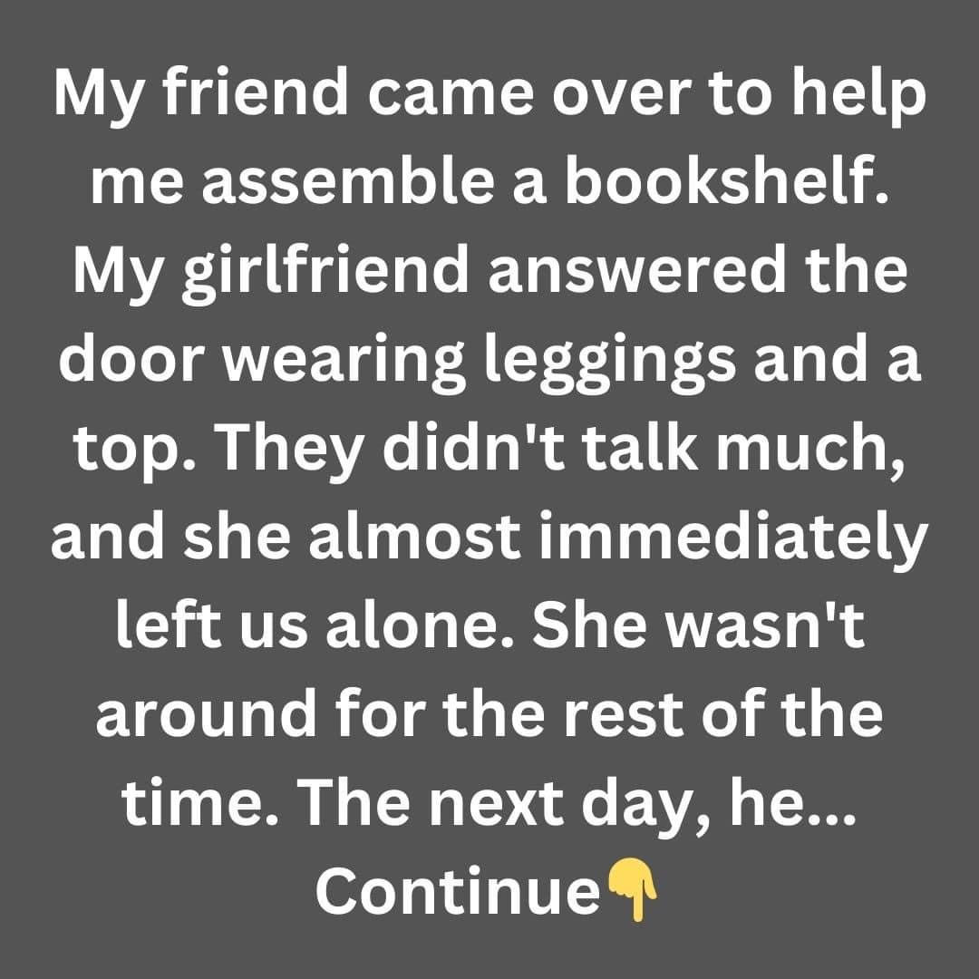 My friend came over to help me assemble a bookshelf. My girlfriend answered the door wearing leggings and a top. They didn’t talk much, and she almost…
