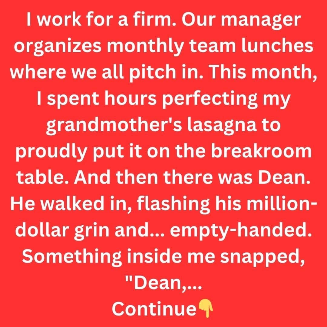Angelina shared her story about a coworker, Dean, who consistently showed up to team lunches empty-handed while others put in effort. At a recent lunch, Dean skipped…