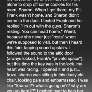 The Attic Secret: A Chilling Family Discovery That Changed Everything My husband had to work late so I went alone to drop off some cookies for his mom, Sharon. When I got there, my FIL Frank wasn’t home, and Sharon didn’t come to the door. I texted Frank and he replied “I’m out with the guys